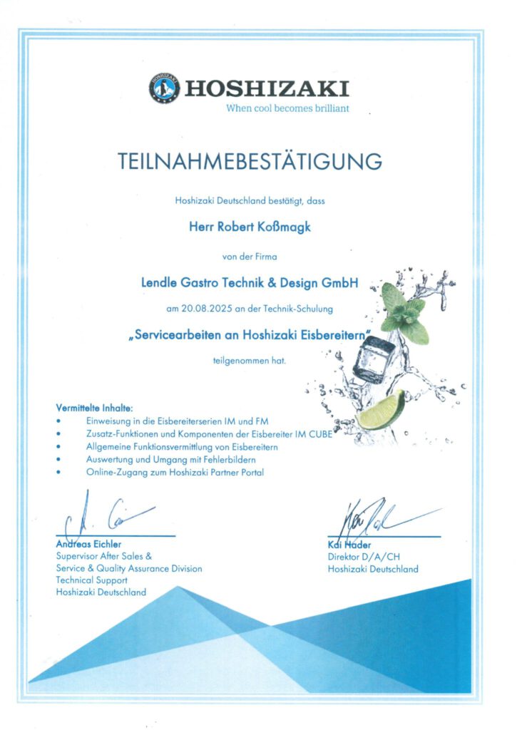 Die Lendle Gastro Technik & Design GmbH sowie alle Mitarbeiter nehmen regelmäßig an Fortbildungen und Schulungen teil, um eine überdurchschnittliche fachliche Qualifizierung zu gewährleisten.